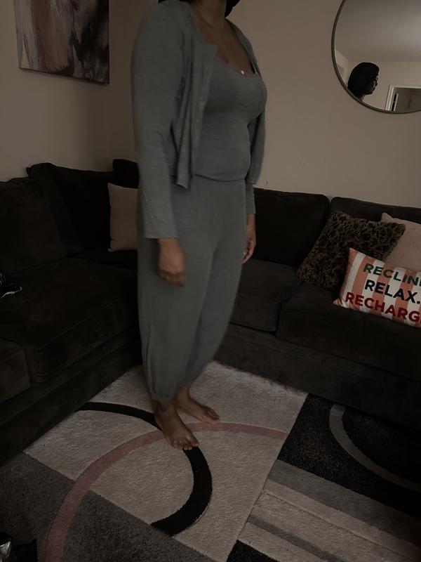 Great set! I love the gray color. The set is comfortable The set is very nice to lounge around in and for bed. The material is thick and stretchy. The only gripe is that the set is not tall girl friendly.
