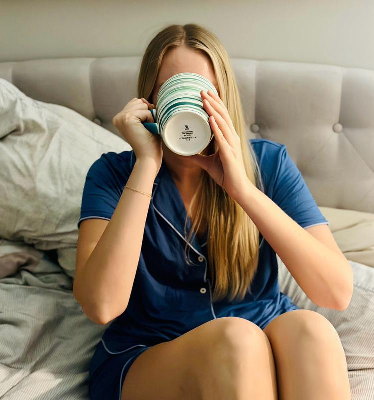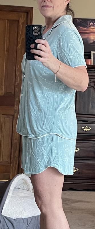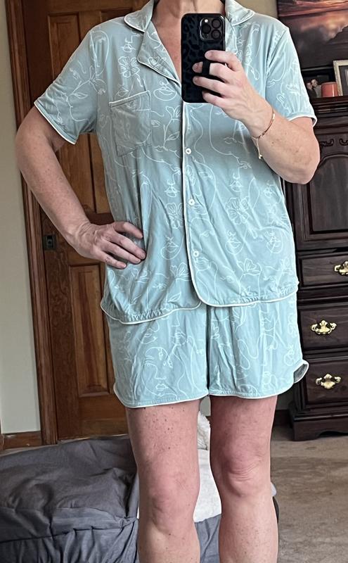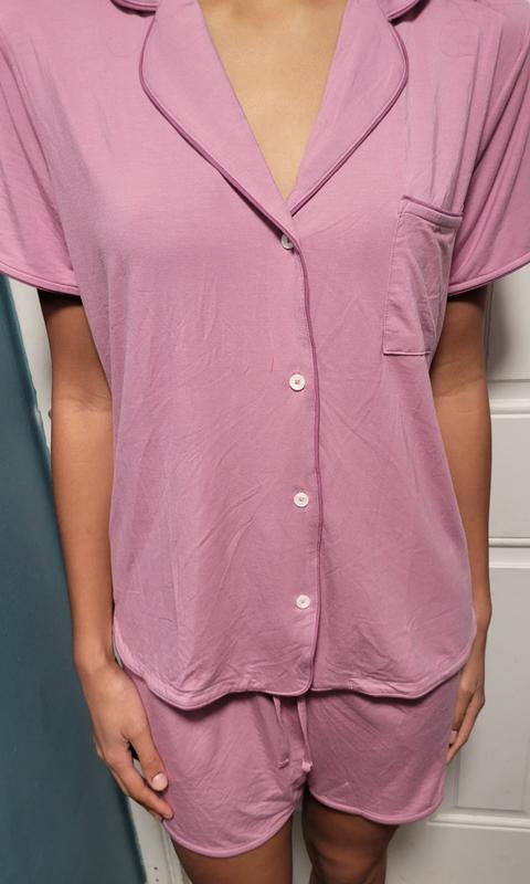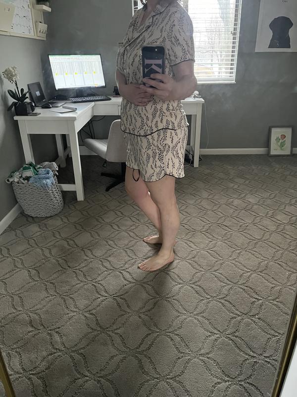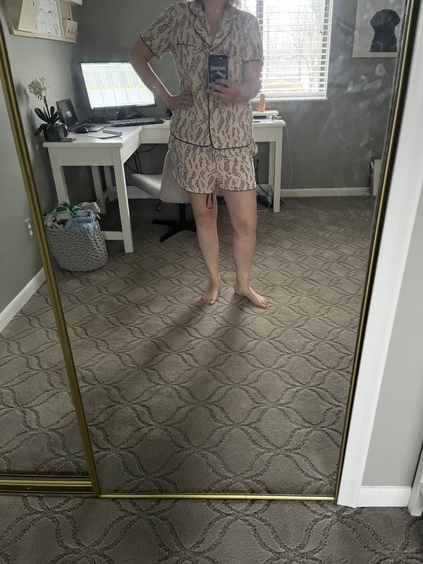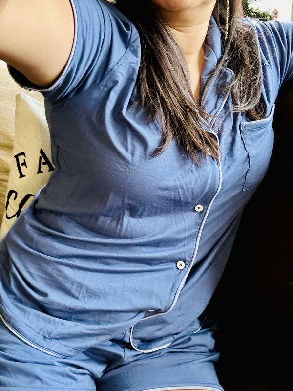 This is a nice little set, but on the top, the bottom hem sort of gathers inward instead of laying flat like a normal pajama top. I have never seen anything like this in my life. They’re comfortable enough and they look nice, but you have to tuck the two corners of the bottom hem underneath because they won’t lay flat. Subtracting two stars for that. They also fit decently.