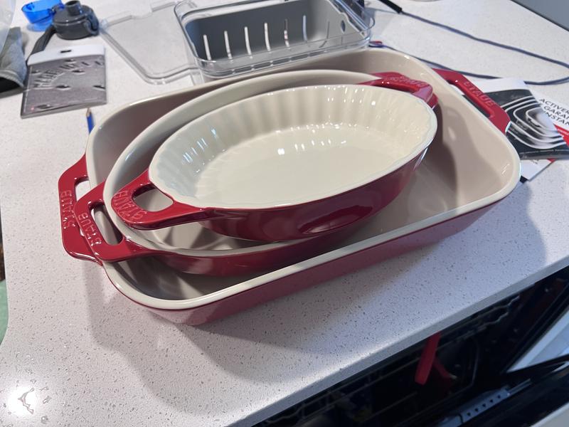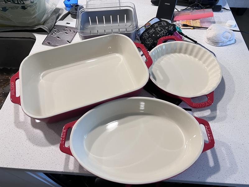 Very excited to have a full set now with this set! The only gripe which is why it’s not a perfect 5 is because the pie dish that came in this set seems to have a little inconsistent glazing of the ceramic and so it will get food trapped in it. I am going to ask staub about this since it seems like a borderline defect.