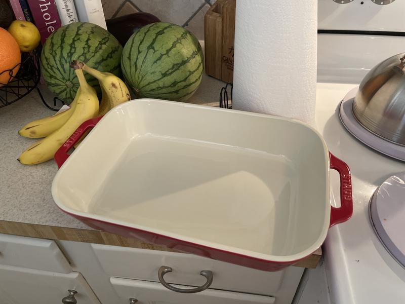 I love this Staub ceramic dish. Due to my husband’s ever changing work schedule, I am often left to prepare meals for just myself when I get home from work in the evening. This 7.5 x 6” ceramic dish is the perfect size to do that. I am able to make Easy, quick & delicious homemade meals for one perfectly in this dish. Cleaning is incredibly easy also. I highly recommend this Staub ceramic baking dish.