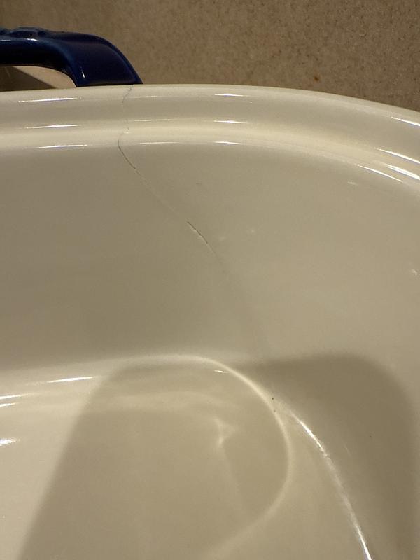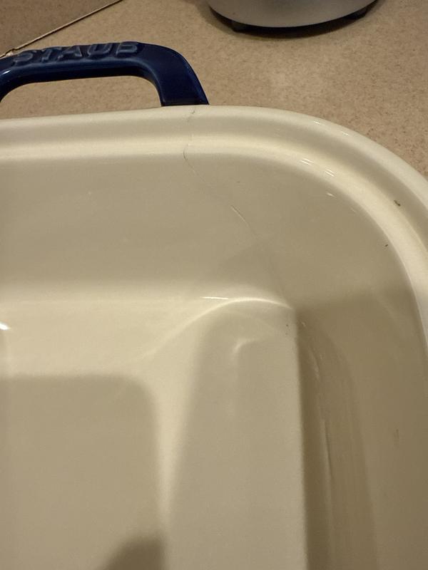 I bought this for Thanksgiving. Used it once and there is a HUGE crack. Tried contacting both Macy’s and Staub. Neither will respond to send a replacement or a refund.