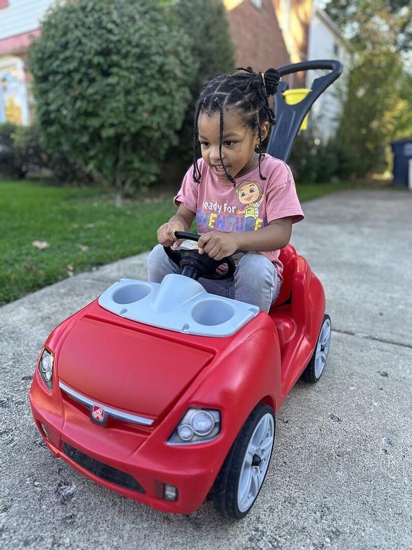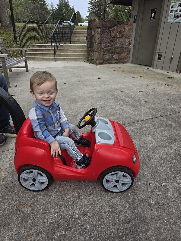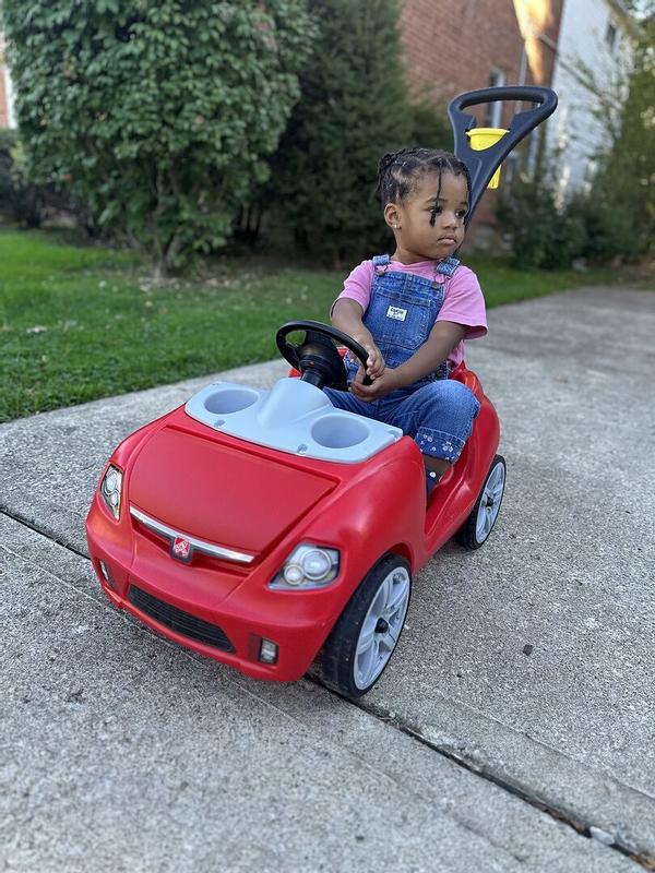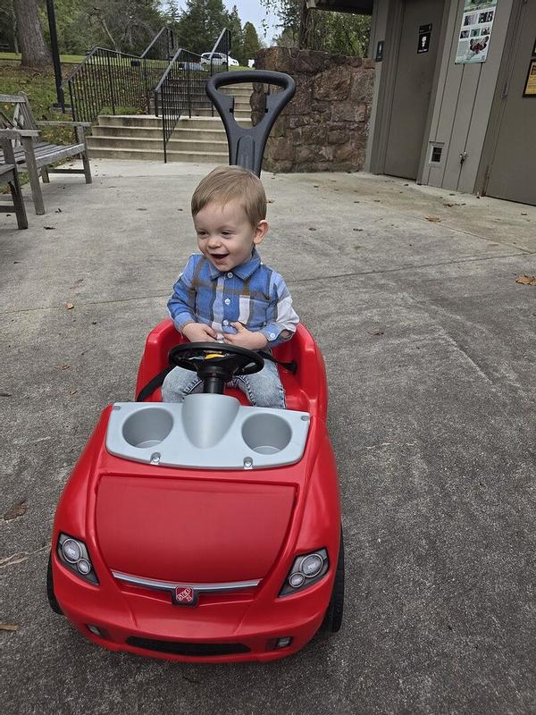 This car is a big hit with our family! My 2yr old daughter and 1yr old nephew love riding in it, & it’s very easy to push around the neighborhood. I like how it has cup holders too so we can bring along a water bottle and snack on our walks as well. My only complaint is that it took a long time to put together and was a little difficult to get some of the parts together. Overall, I’m very happy with the car and think we will be using this a lot!