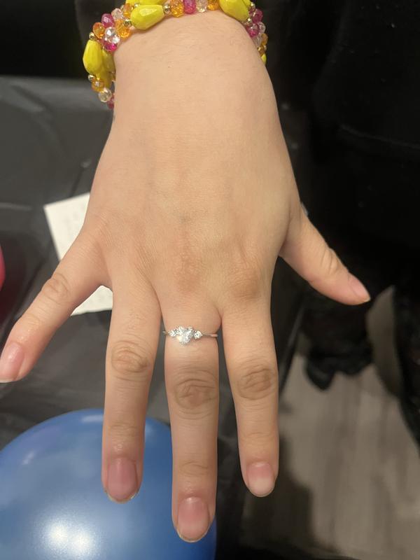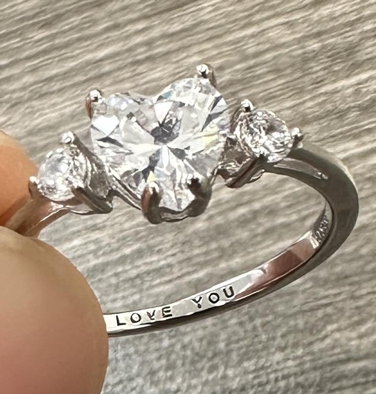I received this ring as a gift. The silver band adorned with a heart shape crystal at the center and a round crystal on either side is beautiful. It is dainty with "I LOVE YOU" on the inside (a nice little surprise). Wonderful present.