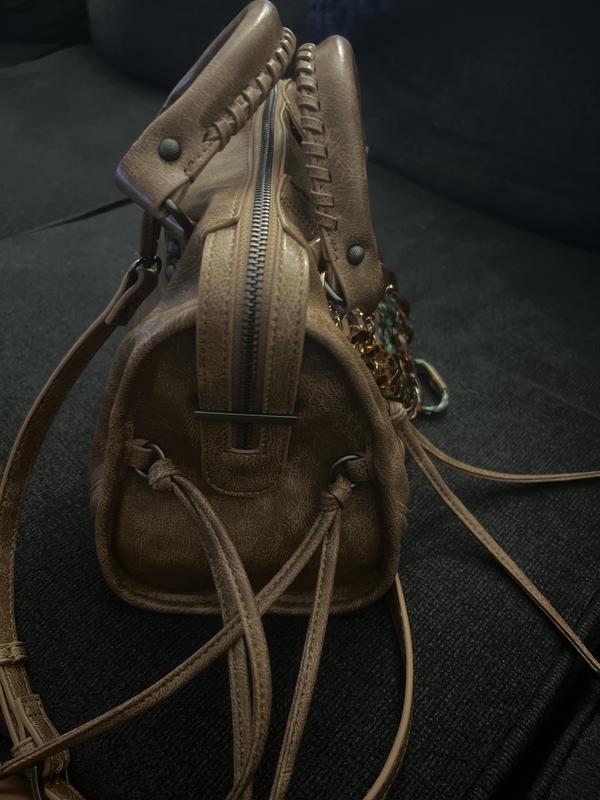 Bigger/ roomier than anticipated. Actually better than expected. The best way I can describe it is Balenciaga and the Louis Vuitton Speedy 25 came together to form a contemporary option within a value budget. I chose the blue because I don't have many blue options in my handbag collection. It can hold a ton for work, school, an everyday option.