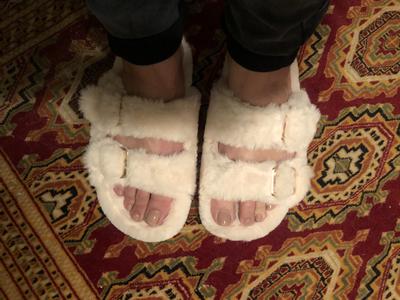 I love these slippers. I purchased a pink color and the fur feels good on my feet.