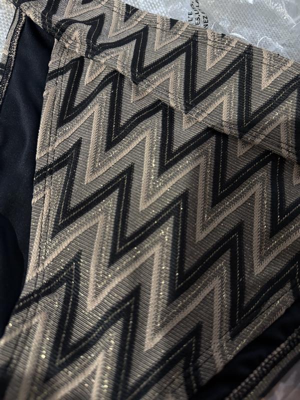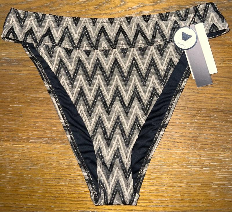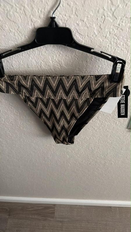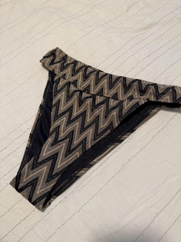 (I was sent this product in exchange for an honest review) I like these bottoms. I got a size medium and the fit is pretty standard. It’s a chevron kind of print, with black, beige and gold. This will pair well and look cute (imo) with a plain black bikini top. The thickness is standard to me, so it’s light weight. It has a thick band so it’s more comfortable around the hips. Overall I like it!