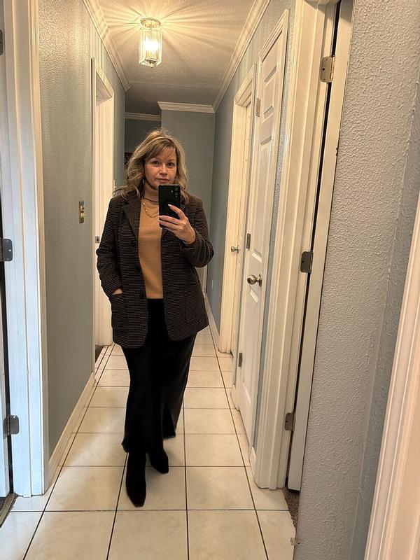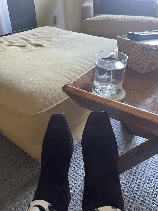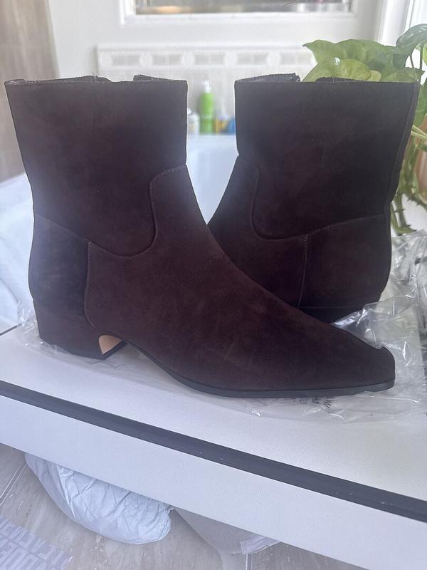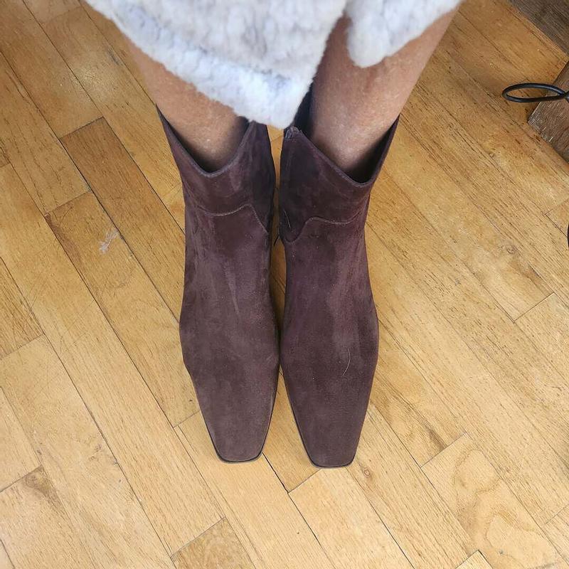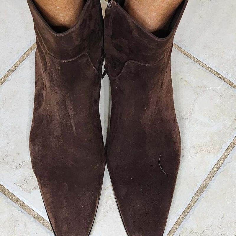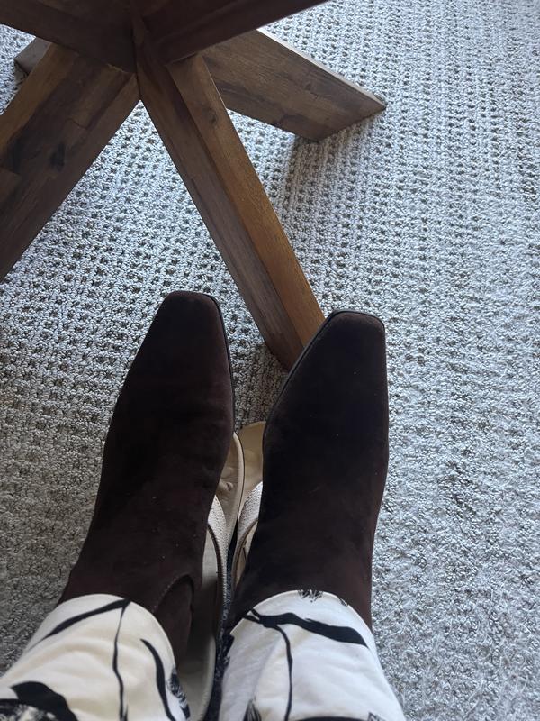 The most supple suede in a rich brown color with a walkable heel and extended toe to lengthen the leg. Chef's kiss! True to size.