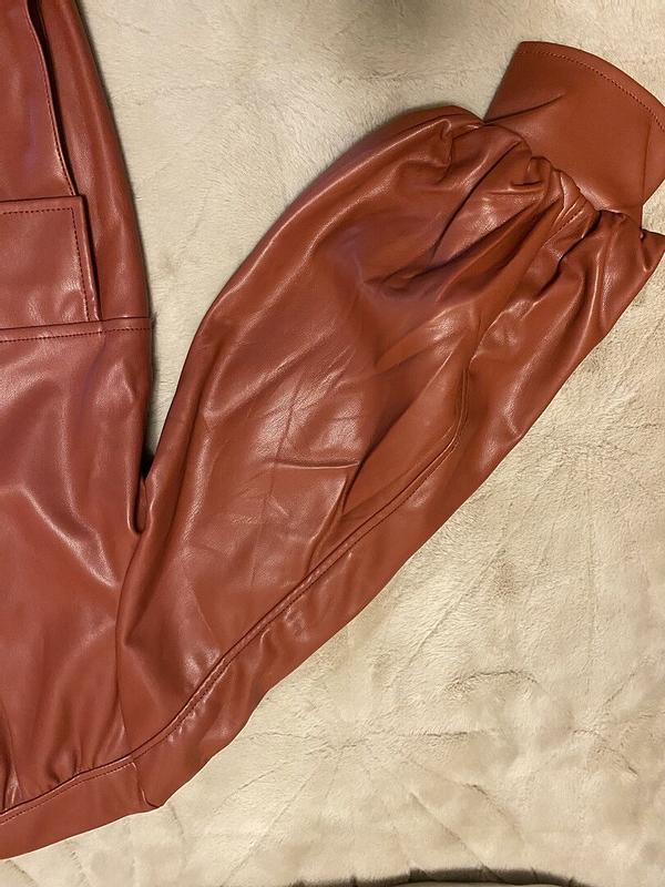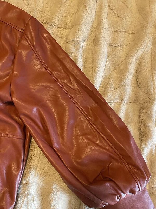 Soft faux leather and loose comfortable fit. I am 5’8” 140lbs. The medium is a good fit although the sleeves are not as long as I would like. I have long arms. I like that the sleeves are cuffed and not elastic banded. I am still trying to figure out how to remove the wrinkles from the packaging.