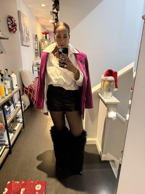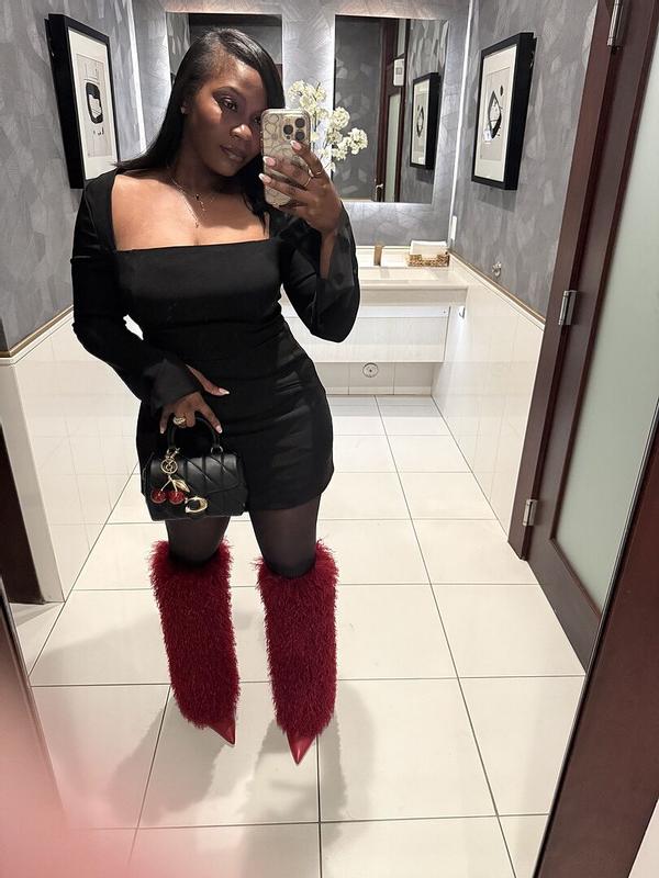 Love these red boots! Wore them to my birthday dinner with a black mini dress. I’m a 9 in boots and these fit (I wore stockings). They are easy to get into, you’ll just want to untuck the top of the boot from pulling them up. Take off was a little difficult ngl. I did notice a little shedding during try on but not while I was out. You’ll love these boots. So eye catching. I got so many compliments, comfortable, and such a statement piece.