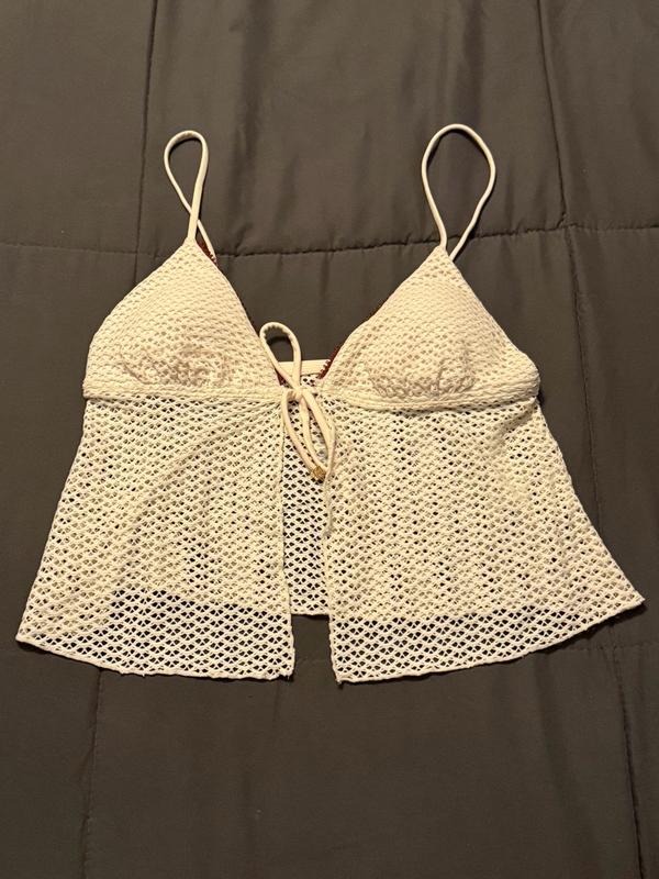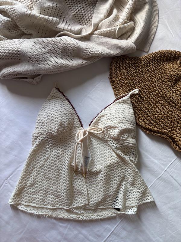 I received this Steve Madden Swim top as a gift from Influenster and Steve Madden for testing and reviewing purposes . This Steve Madden crochet tankini crop top is an off white color, it has a golden brown trim around the top and gold beads hanging from the front tie. It's a nice material that doesn't feel cheap and seems it will hold up well getting wet or being washed. It fits true to size and has a little stretch to the material and adjustable straps. One thing that concerns me is the tie front , if it comes untied then the girls are out. But it's a super cute bathing suit top that would look cute with some beach pants as well.