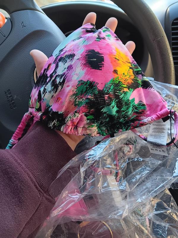 This triangle swimsuit is very pretty and can be matched with a variety of swimsuit bottoms. The gold rings on the sides add a dainty touch. I gave it 3 stars because it is a size large, but the triangle cups are a little too small.