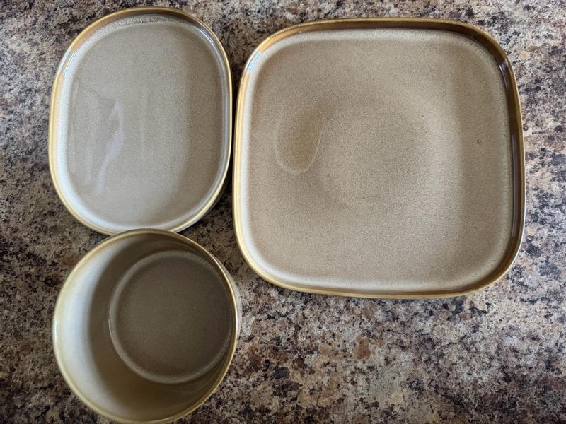 I love the unique shape and the quality of the stone Lain Cairo dishes. They are heavy and sturdy and look beautiful. When you put a dish in the microwave, it is not hot to the touch so you can easily take it out of the microwave without burning your fingers. I just wish they had coffee mugs to go with the set. Hoever, it is easy to find mugs in sand color.