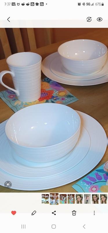 I really like the style of this set. The white is elegant and the ridges in the borders of the plates and on the mug and bowl are interesting and subtle. I love how big the bowls are and the ridges actually make it easier to hold on to when you are sitting in front of the TV holding the bowl and not at a table. The plates and bowls are surprisingly lightweight for being stoneware which is nice for handling but does make me think they will chip easily. I guess time will tell on that. Overall I really like these and can't wait to keep using!