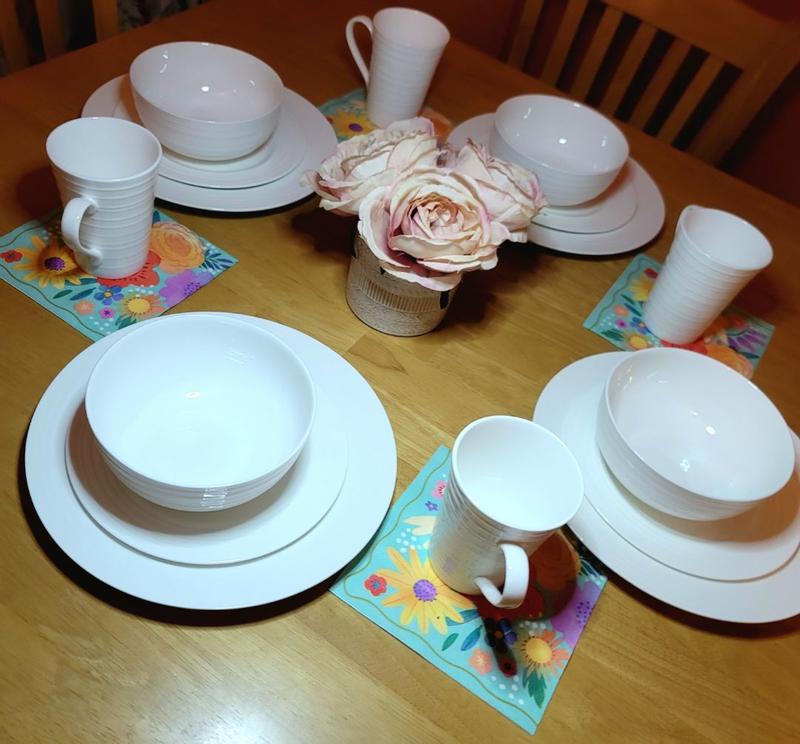 I received this product in exchange for an honest review. These are beautiful dishes. They are light, simple, and have a clean, modern design. The adorable bowls are the star of the show and are perfectly sized for soup or oatmeal. The coffee mugs are also gorgeous. My only complaint is that the edges don't appear to be finished as well on the dinner plates as they are on the rest of the set. On the bowls, mugs, and small plates, when you run your hand along the edges, it's perfectly smooth. The large plates feel rough along the edges, enough so that you can even hear a scraping sound. I hoped this would smooth out with use, but not so far. Overall, this is a practical and classy looking set of dishes.