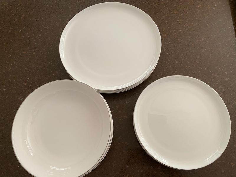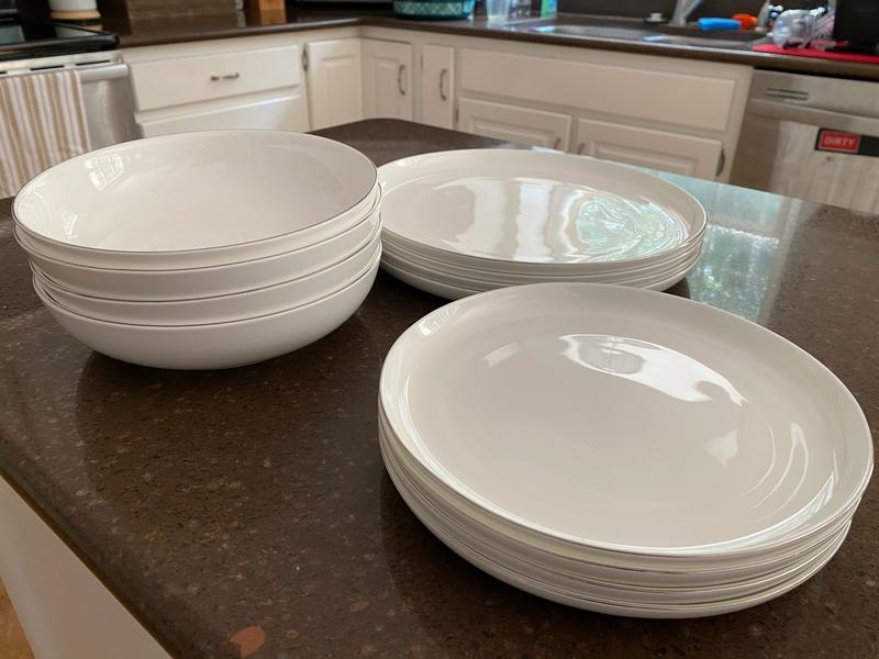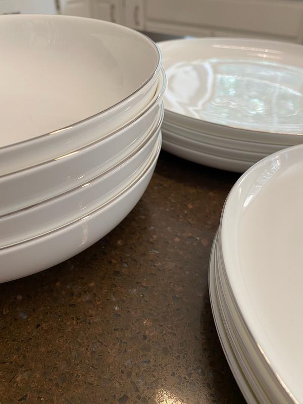 I just love this porcelain everyday set. They look elegant and are microwaveable and dishwasher safe. I purchased the white set with no trim. Many compliments from guest who all liked the raised lip around the plates. The bowls are large as other shoppers stated, but for pasta they are more than perfect. These dishes are my go to for elegant parties as well as everyday.