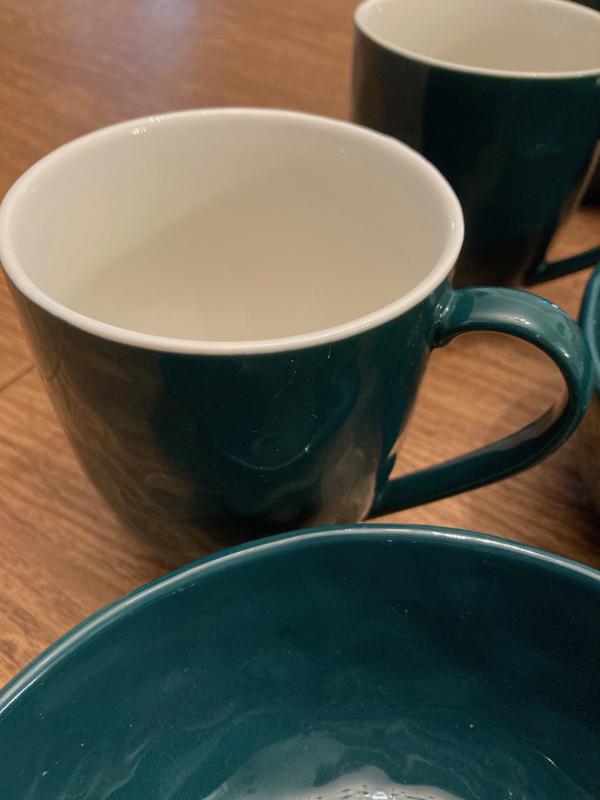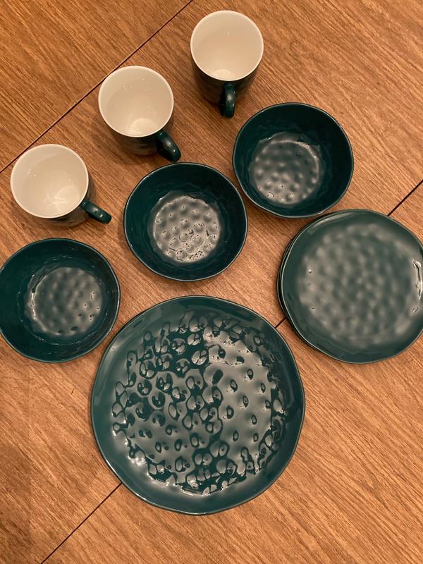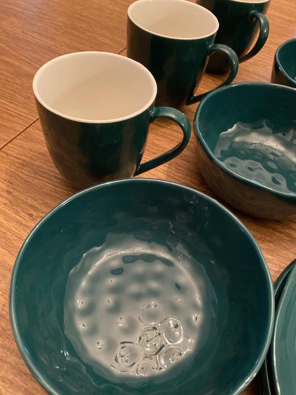 This dish set is 24 pieces and enough for 6 people. It’s a gorgeous dark green and I love the texture it has. They are dishwasher and microwave safe which makes using them even easier! I am so excited to use these and will purchase from this brand again.