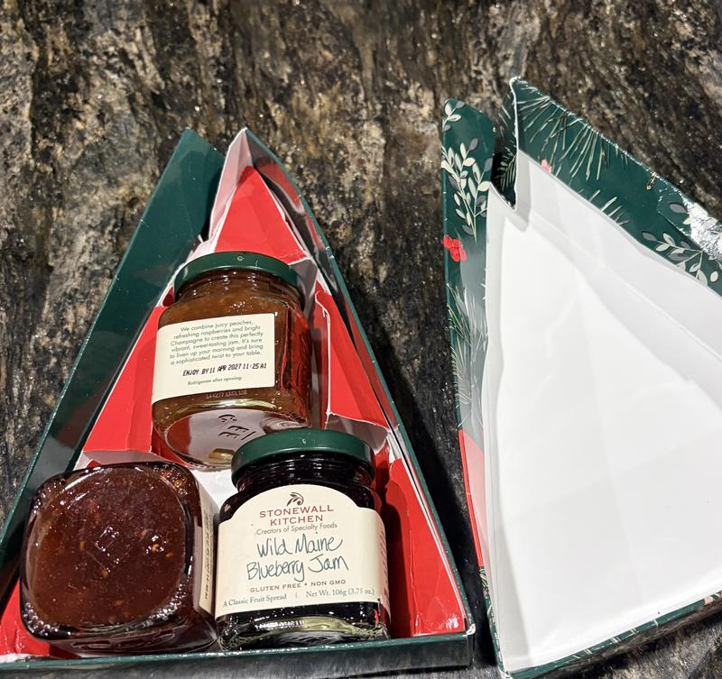 The Stonewall Gift Tree Jams are a nice concept however, the packing job is horrible! The item came much later than all the other items placed in the order. When the box finally arrived I noticed the box was lopsided. The jams were squished in a box too small causing the gift box to be smashed. Two of the 3 jams were upside down or sideways in the gift box. There was no packing materials for this item so subsequently 1 glass jar was chipped and the glass was loose in the box! Macy’s need to take better care in shipping breakable items. I re-taped and hot glue gunned the gift box back together enough to make it look somewhat presentable to give as a gift. I attempted to return this item but it is a non returnable item, so I had to accept it as is!!