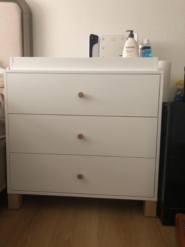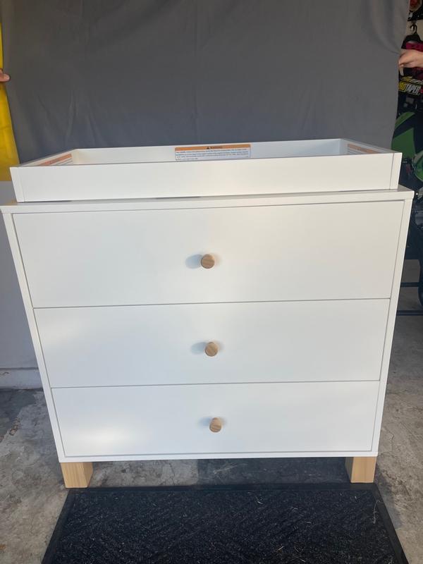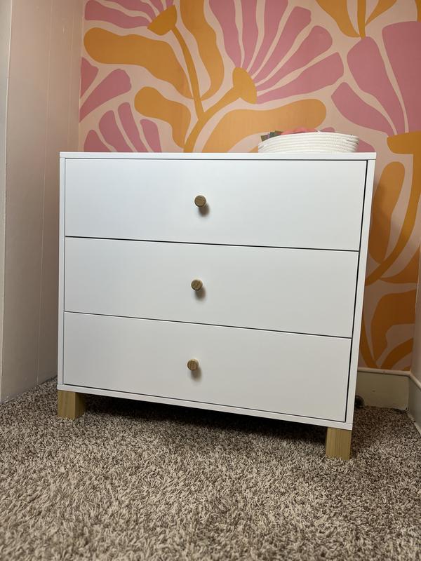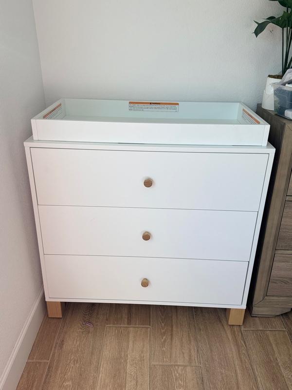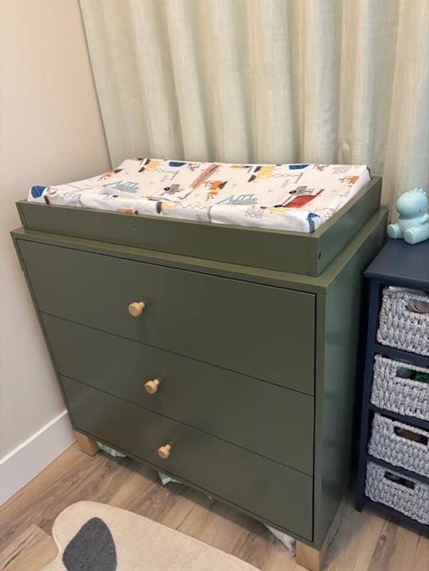 We got this dresser 3 months ago and have been using it daily since. The drawers are incredibly spacious and fits everything we need in them. I really like that we can remove the changing topper for when our son is older so we can continue using this dresser. Assembly was easy and the instructions were very clear so I was able to assemble this myself In about an hour. I also really love the colour! We got this in the olive to match our crib and so happy we did as it adds the pop of colour we were looking for.