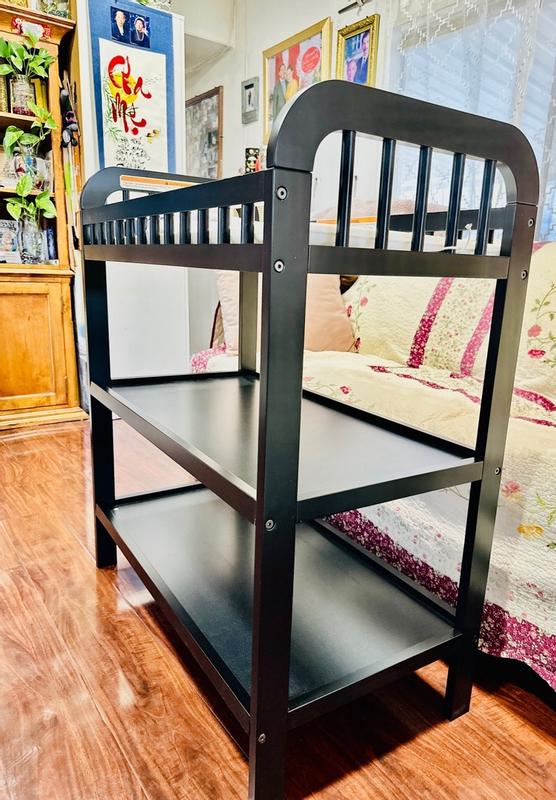 This changing table is so adorable! I love the 2 shelves underneath and use it for diapers and wipes. I really like the dark wood color and flows nicely with the rest of our furniture. It's sturdy and the little pad is just enough to add a little comfort. It makes changing a diaper easy while standing, I don't have to slouch over very much at all. Thank you!!