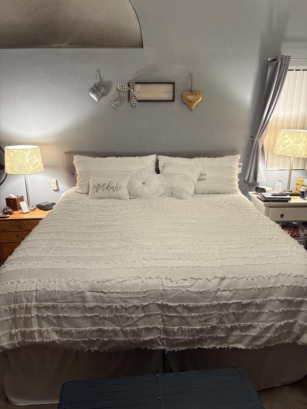 I used this comforter set for my guest bedroom. The design is simple and pretty. The bright white color made everything look more vibrant and clean. Everything was easy to use. It came with a bed skirt, two shams, three decorative pillows, and a comforter.