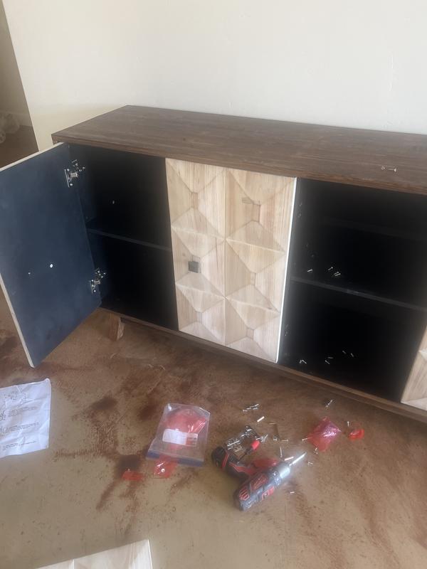 Looks beautiful. The screws are so soft that they strip and when screwing on the pull handles the back of the door is so thin that the screws bury into the wood. The hinges don’t adjust the doors enough and my husband had to shim the hinges out so he could close the gaps on the doors. He can put anything together, so that is a plus.