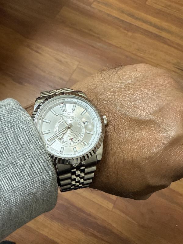 StuhrlingDatemaster II Men s Swiss Automatic 42mm Stainless Steel Watch, Silver Dial, Fluted Bezel, Day & Date, 100M Water Resistant