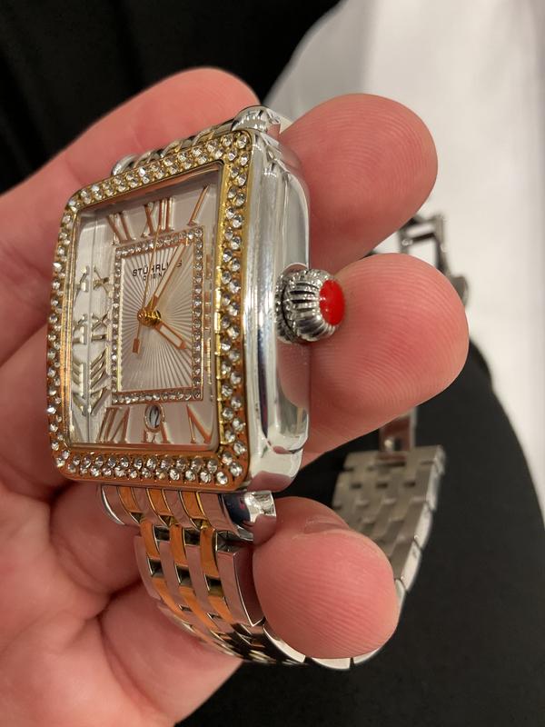 this watch is very elegant. Reminds me of the Michele watch that my husband gave me, but this is a fraction of the cost. I bought it on sale at a good price. Very pleased with his purchase. When I took it out of the box, I noticed that it was way too big for me. So I took two Macy’s near where I’m staying this summer. The woman in the jewelry department was very nice. She told me that it was no problem for her to take the extra links out and fit it to my wrist. I was so happy about that. Because if she could not have done that or would not have done that I would’ve returned it. So I’m very happy with Macy’s all around and with the customer service at the store.