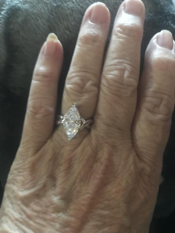 Beautiful ring, and I would probably keep it if the center stone weren’t so large - too large to be realistic looking. Probably at least size of 4-6 ct - at least 1/2 inch long.