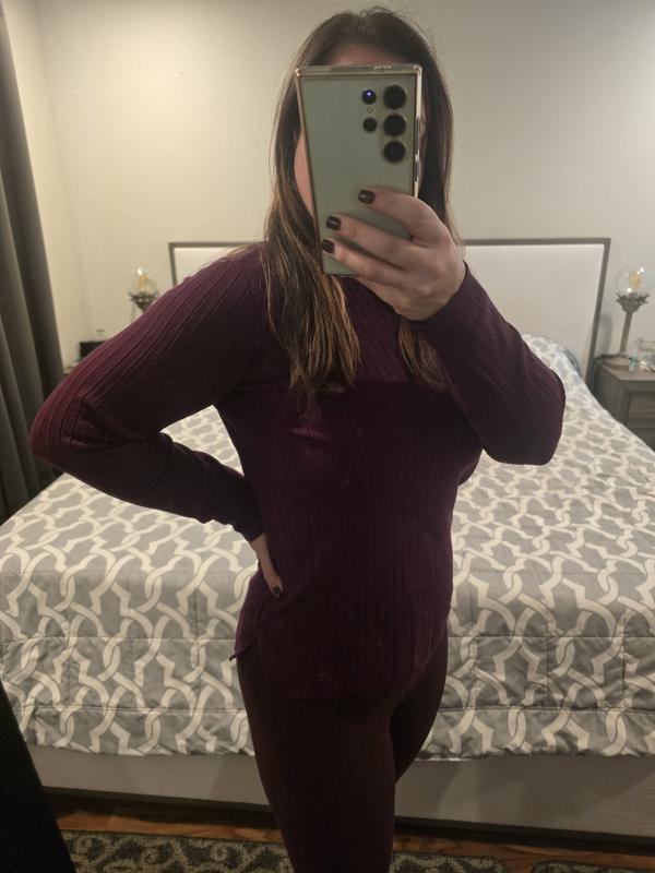 Very pretty color dark burgundy which is trending right now for fall. This top has a boat neck and small side splits. The style is great for any occasion, casual or work. Its a soft good material and stretchy. The sleeves are perfect, not too short and not too long. I wore it with jeans and leggings. I got the PS size, I'm 5'2 and 145lb. I also washed it and it looks same as new.
