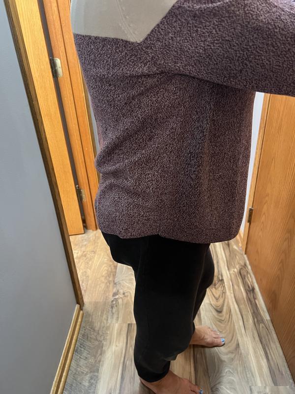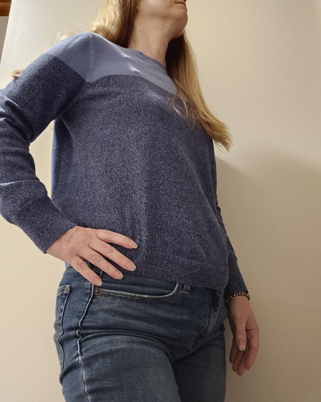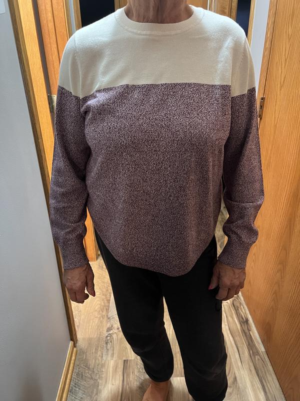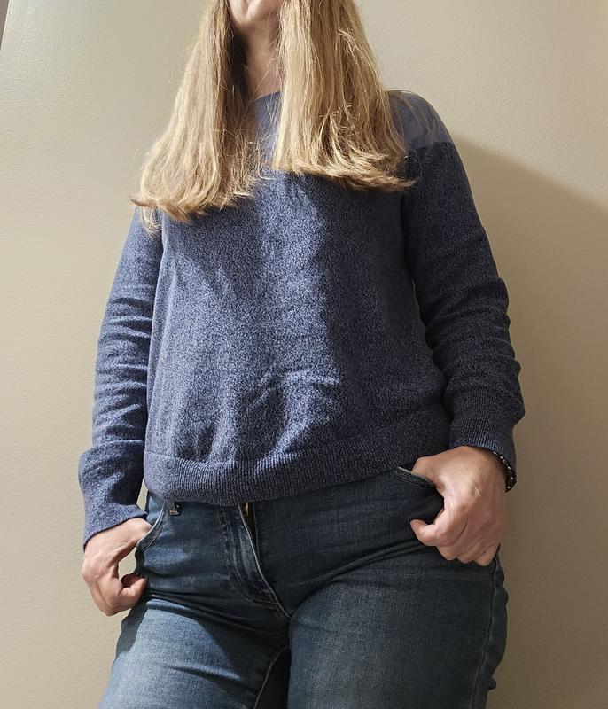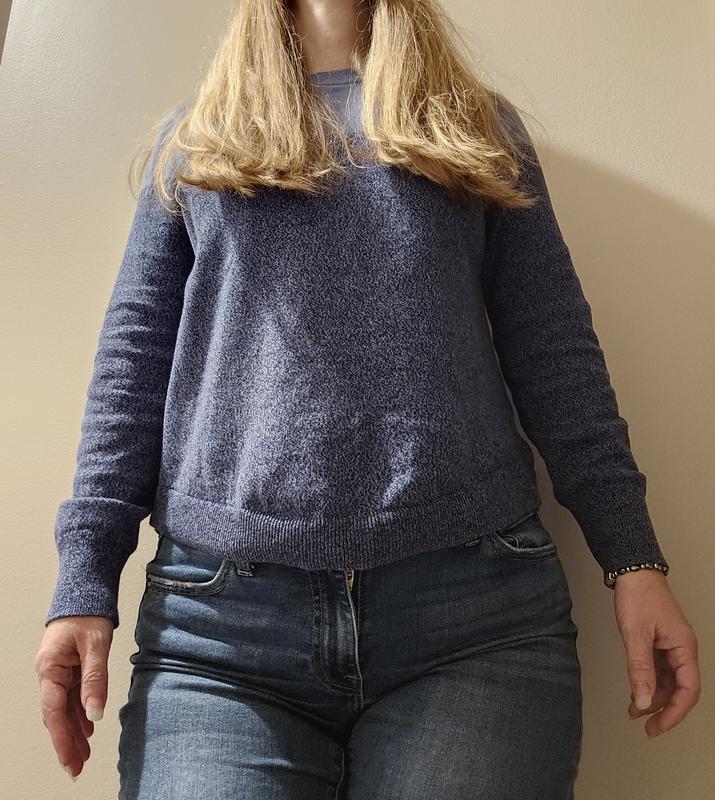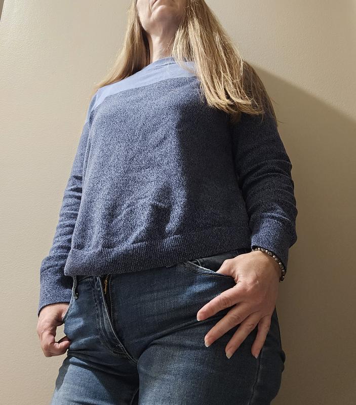 Great lightweight sweater for fall. I love the shades of blue and the sleeve length is perfect in petite size for short arms. The curved hem does want to try to roll just a bit, so I'm hoping that doesn’t get worse with washings. This pairs great with jeans for work.