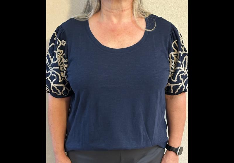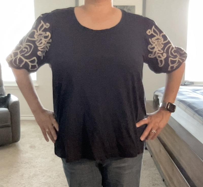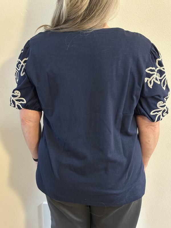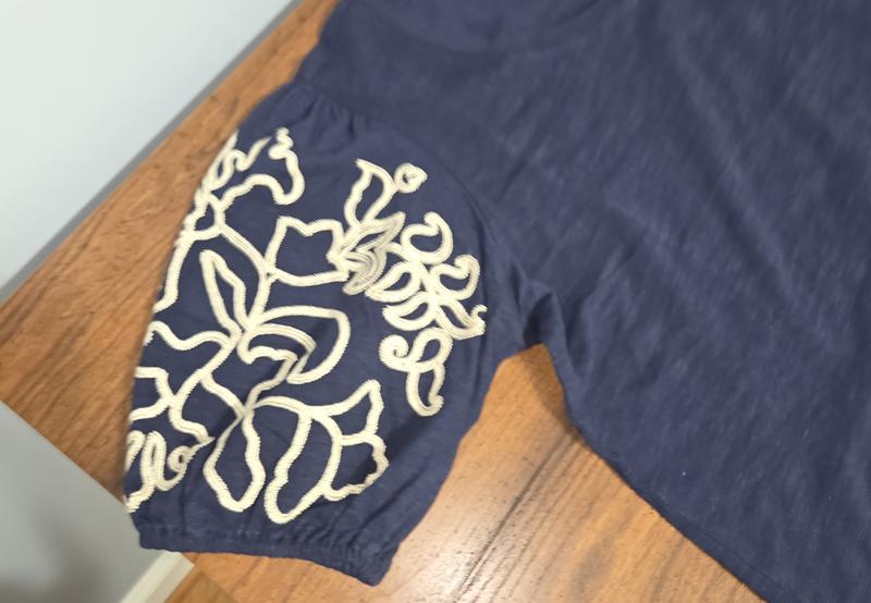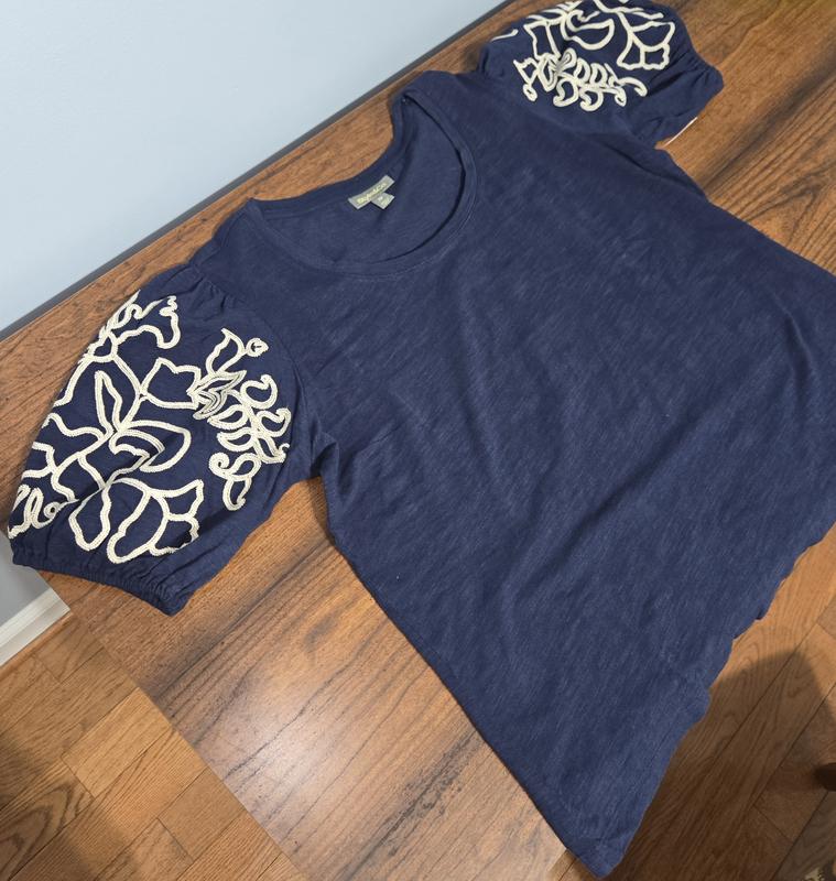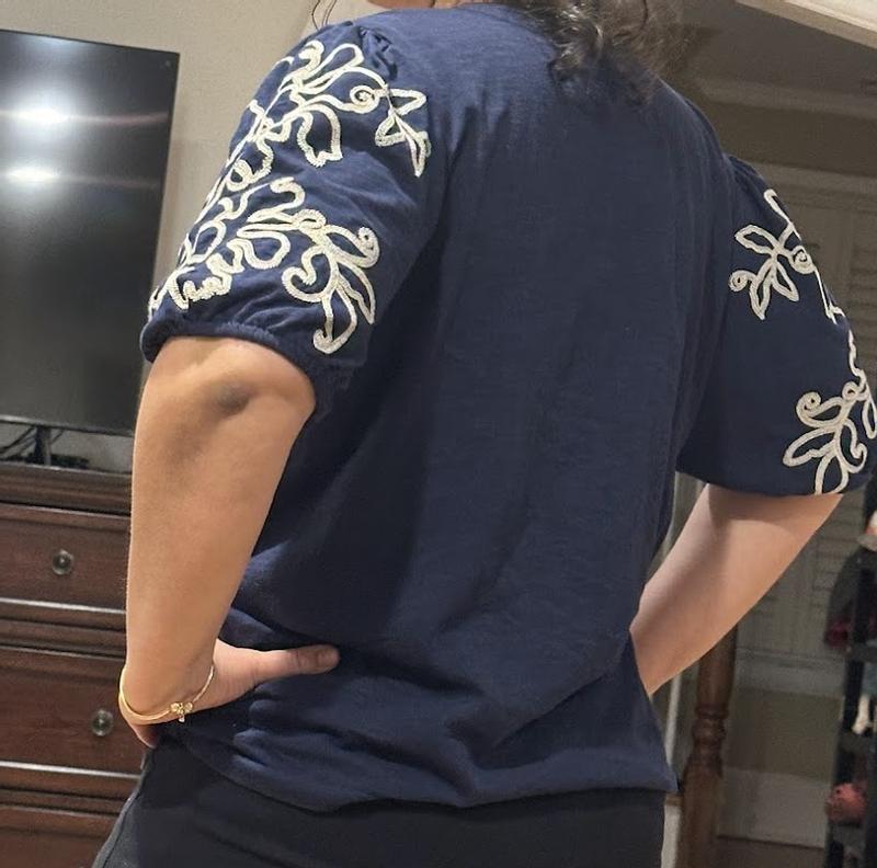 This navy blouse is such a charming find! The deep navy color is rich and versatile, but the real star of the show is the intricate embroidery on the sleeves. It perfectly balances casual comfort with thoughtful, artistic details. I am absolutely in love with this top!