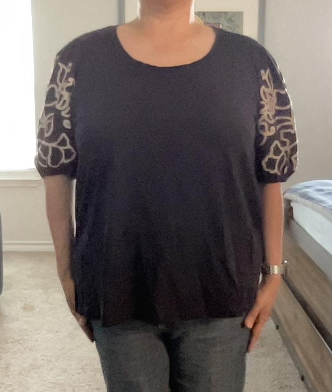 Very cute top. I would have given it 5 stars if the neck line was V instead of round. For someone my size, a V neck line is more flattering. Nonetheless, I like the top. Embroidery is pretty and it will be a great top to wear this Spring. In the picture it gave me the idea that it was more like a knit sweater type, I expected a different texture, however, being 100% cotton is good enough. I love that it comes in Petite options and it is very true to it's size.