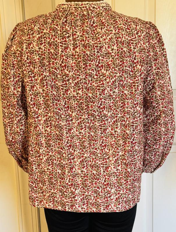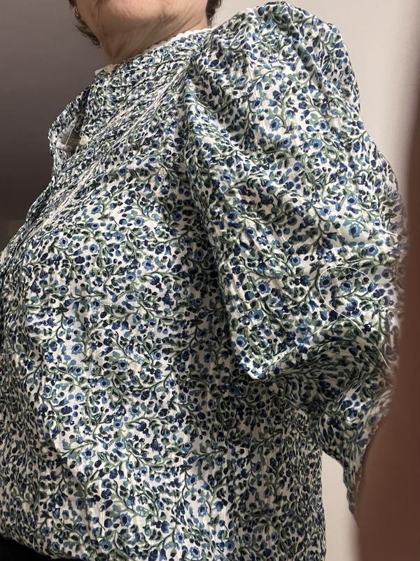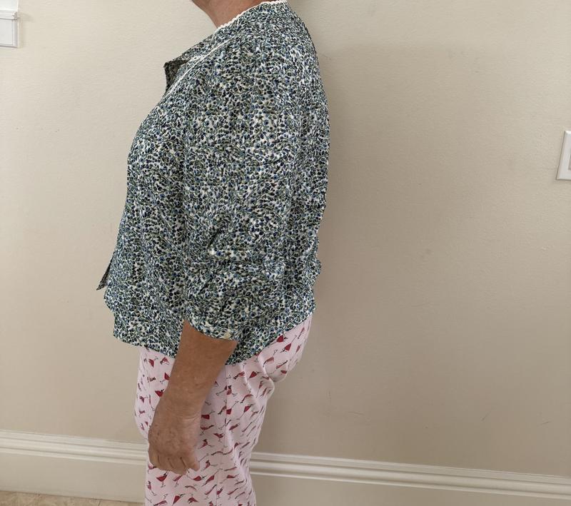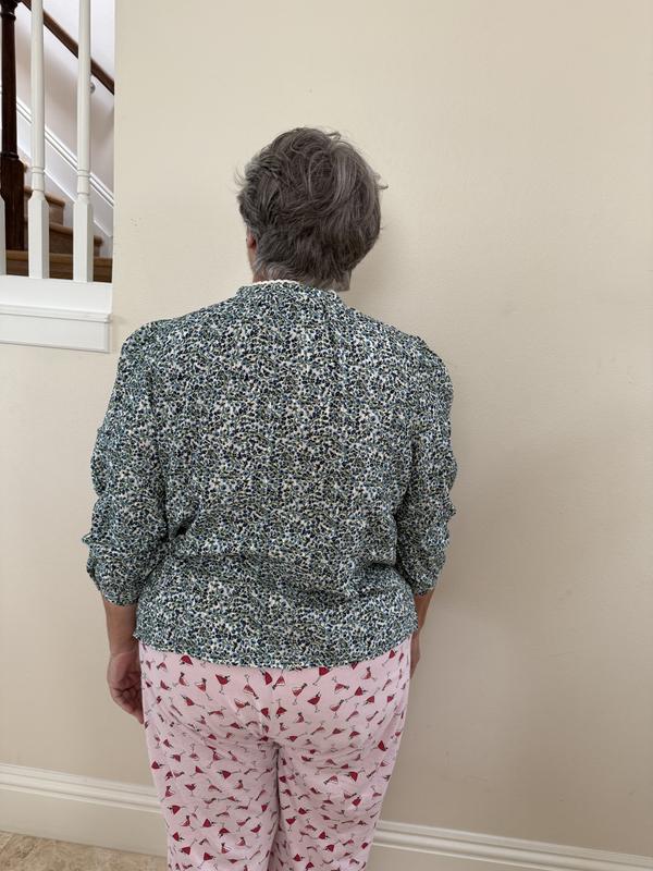 This style of top is really comfortable and has a nice floral pattern. The bubble sleeves adds a little flare and I like that it’s three quarter sleeve. The only aspect of this top I did not like is the high neck. Otherwise a good choice.