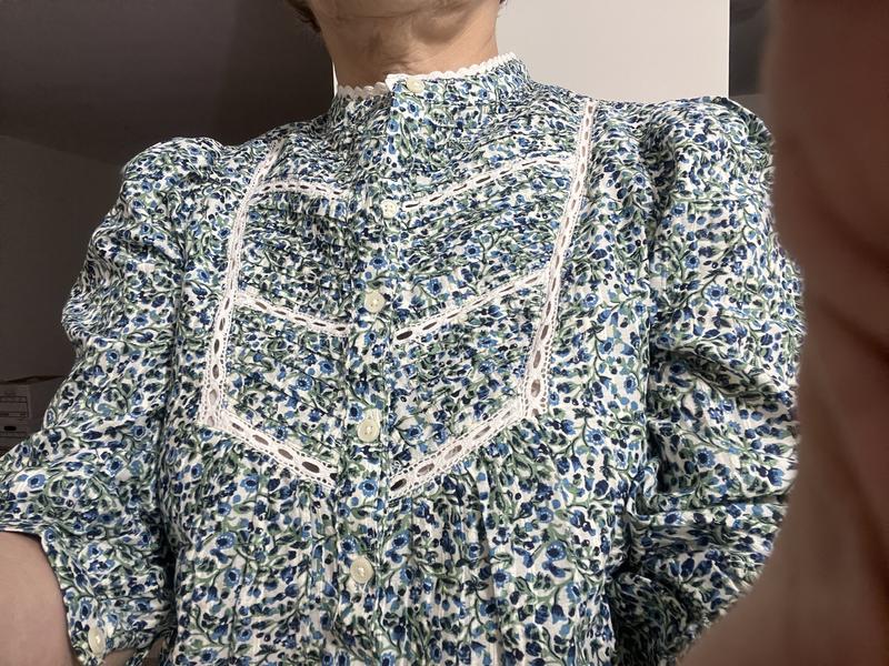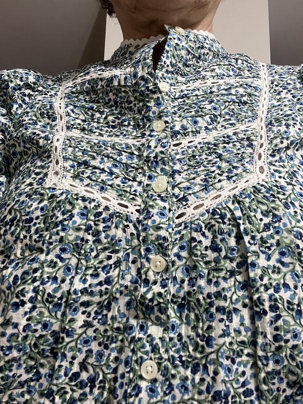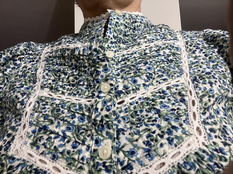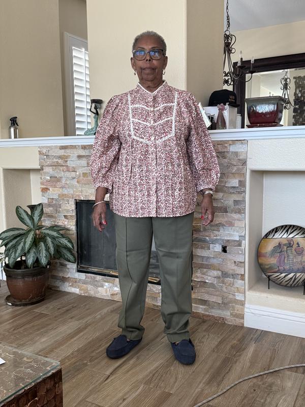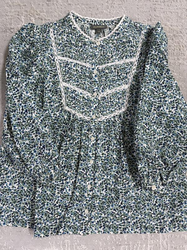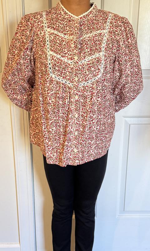 I love this Floral Vines Femme Lace Top! The delicate green floral pattern gives it such a soft, feminine look, and the lace detailing adds a pretty vintage touch. The fabric feels light and comfortable, perfect for spring or early fall. The fit in size PP (petite petite) is just right — not too tight, and it sits nicely at the waist. It pairs beautifully with jeans or a midi skirt, and the puffed sleeves make it feel a little special without being too much. Overall, it’s a charming, versatile blouse that looks even prettier in person than in photos. Highly recommend!