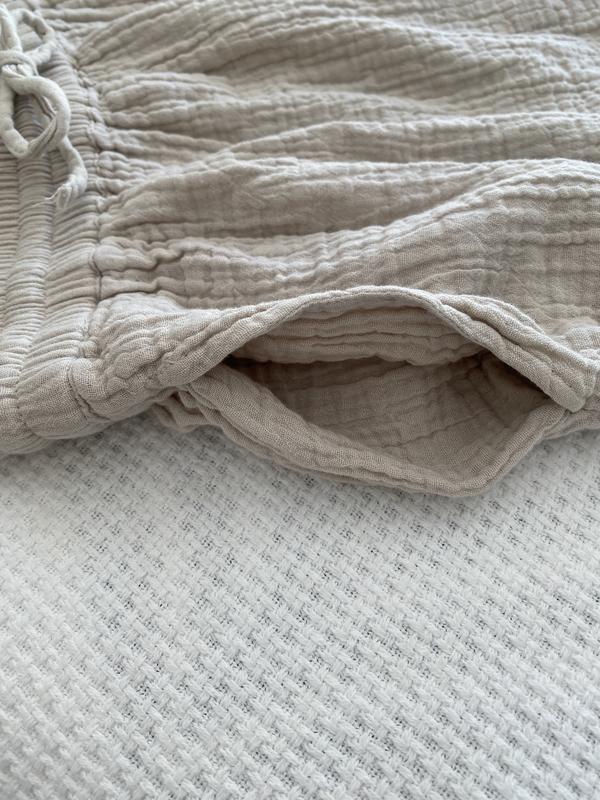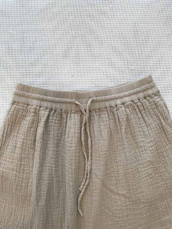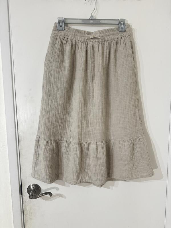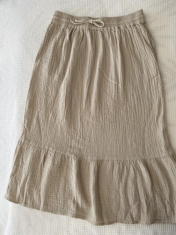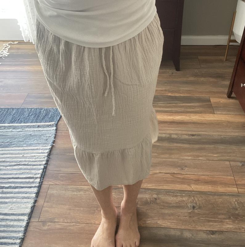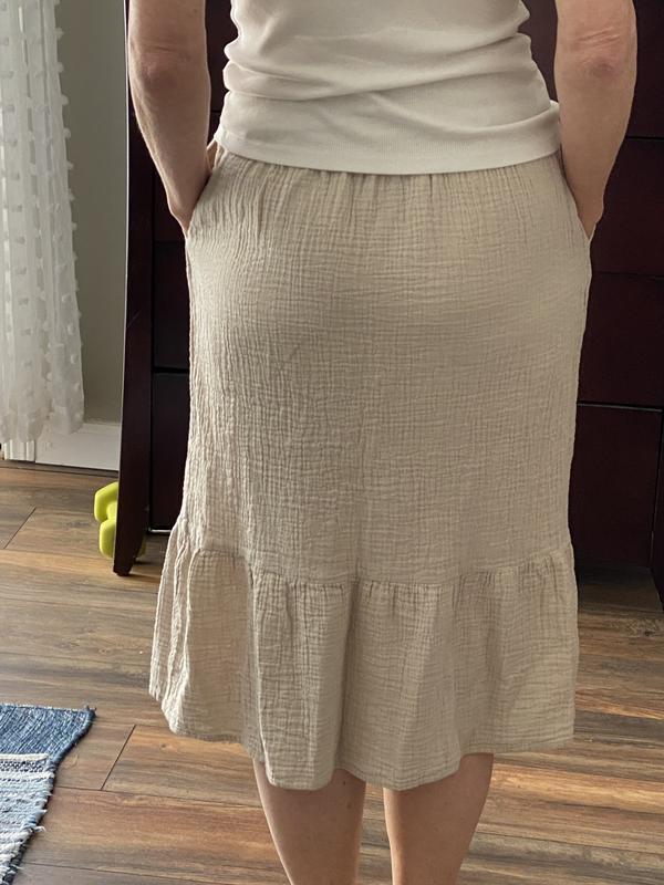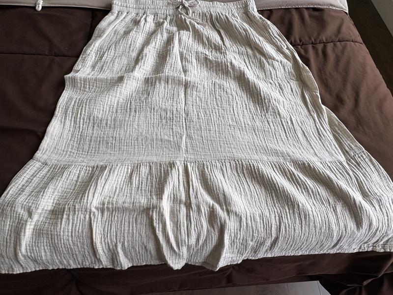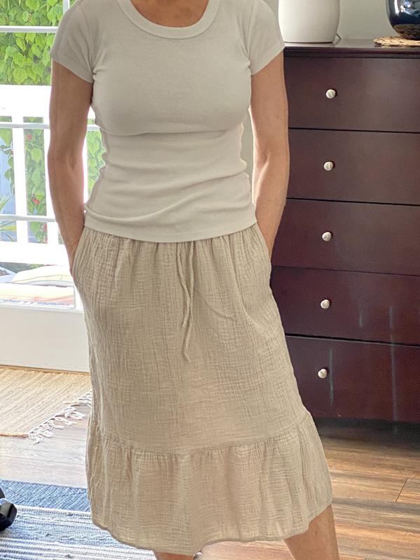 Cute lightweight summer 100% cotton skirt. It has pockets which I love. It’s light enough to wear as a cover up for a day at the pool/beach. The natural crinkles in the fabric are a plus - which means no ironing and you can twist it to create a more crinkled look. It sits nicely with an elastic waist which is very comfortable and has a cute tie in the front.