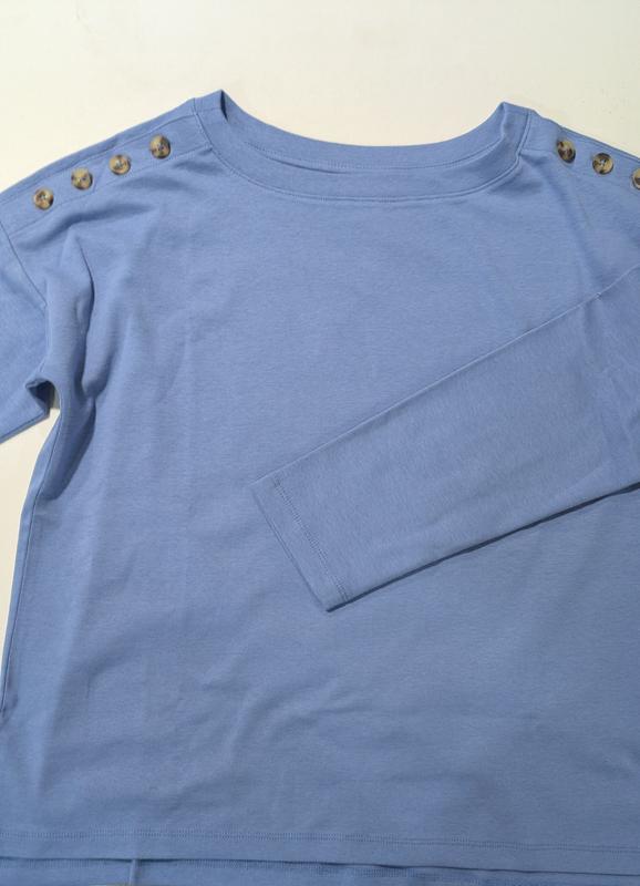 Soft, one hundred percent cotton, long sleeve sweater with decorative shoulder buttons. Lightweight and comfy. Perfect for everyday wear or layering in any season.Im 5'3"and 125 lb and my size is XS. It has a regular fit.