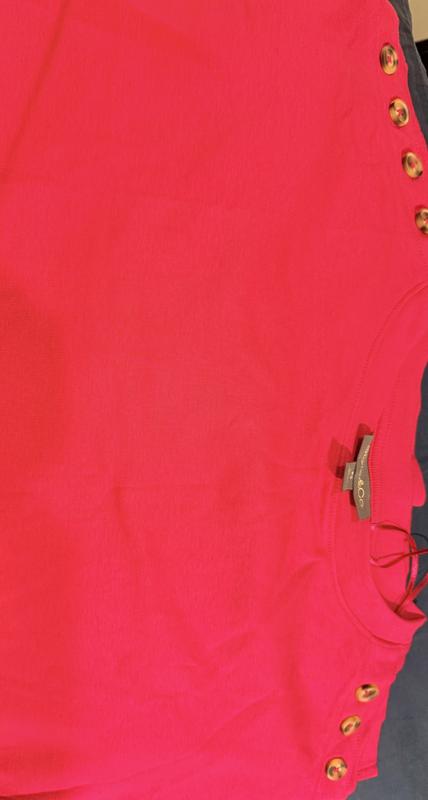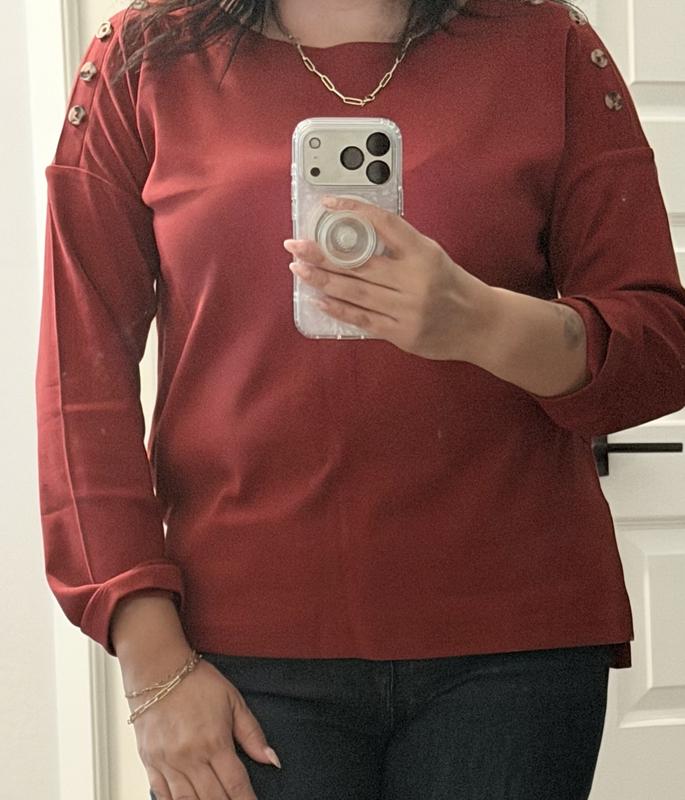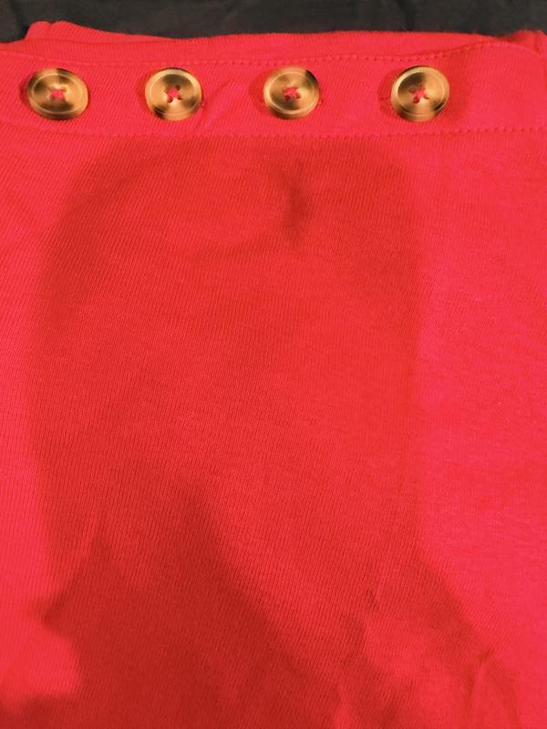 Cute top, runs large. I would go a size down. Material is thick and buttery soft. Perfect for fall weather. I have washed it a few times and the color is still bright and looks like a new. It has buttons on each side on shoulders and they add an extra touch to the cute top