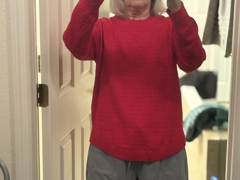 This is a very pretty sweater. One of the photos shows the little bubble effect of the fabric. Subs true to size and is perfect with either a skirt or slacks. Fabric is soft with long sleeves and is a pullover. Perfect.