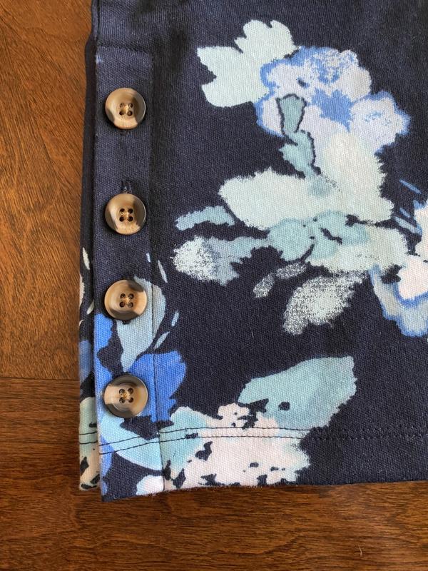 I got this as part of a promotion. I am usually a size PM and chose a PS for this shirt because of its shape. It ended up being too small. The print is very nice. I also like the buttons on the sides.