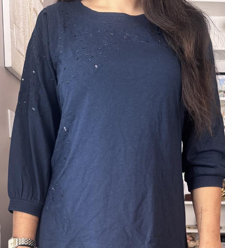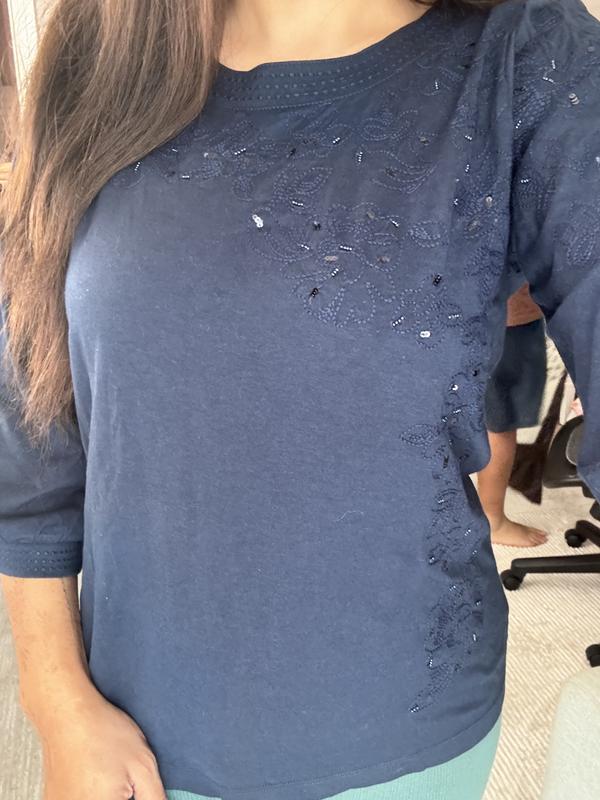 Nice top very simple and nice at the same time , love the flower details perfect long and the 3/4 sleeve are a nice toch for someone that dont particularly like long sleeves, material are good very casual look