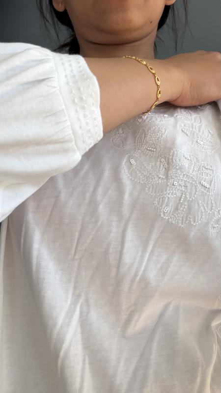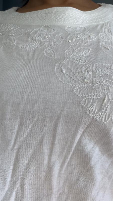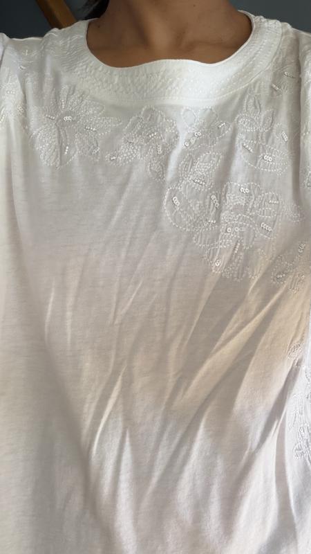 This top is cute, fits comfortable and has a very subtle sparkle which I love. It has embroidery is the same color as the top which gives it a very minimal yet elegant look. Size PM fit perfectly and the only reason I docked 1 star is for the sleeves. It’s slightly itchy because of the elastic which makes it a bit u comfortable but otherwise it’s very cute. Very light and a soft cotton material.