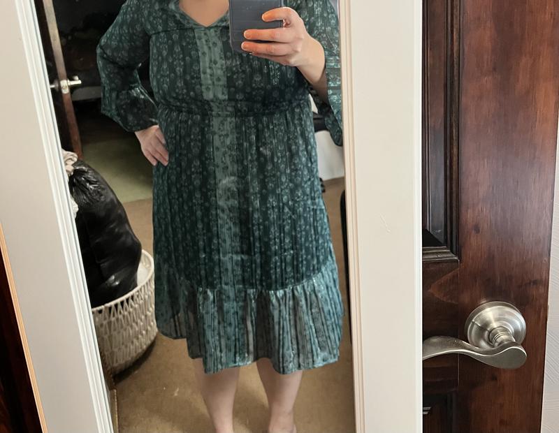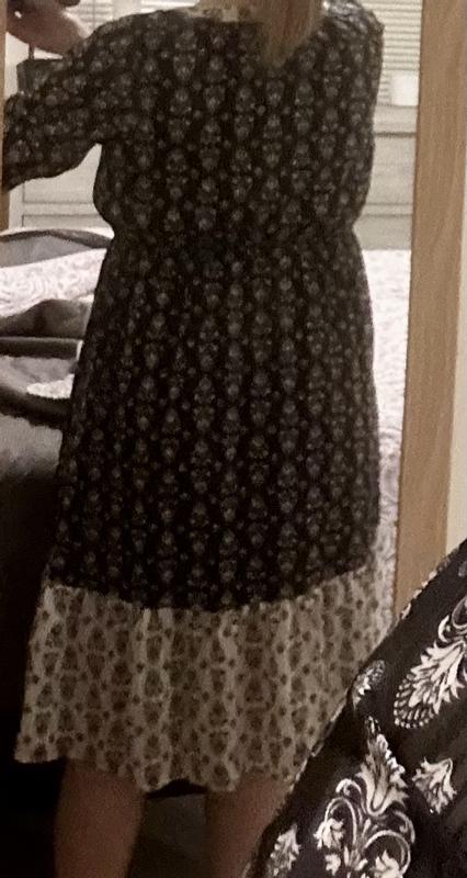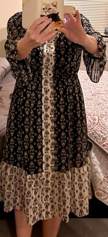 Printed lightweight mid length dress. Perfect to wear as casual with flats or dress up with heels. The dress has subtle sparkle that you can use to dress it up and it also has pockets! The dress is comfortable but the empire waist band does shift somewhat to allow more comfort.