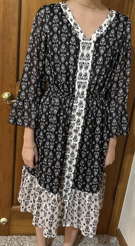Printed lightweight mid length dress. Perfect to wear as casual with flats or dress up with heels. The dress has subtle sparkle that you can use to dress it up and it also has pockets! The dress is comfortable but the empire waist band does shift somewhat to allow more comfort.