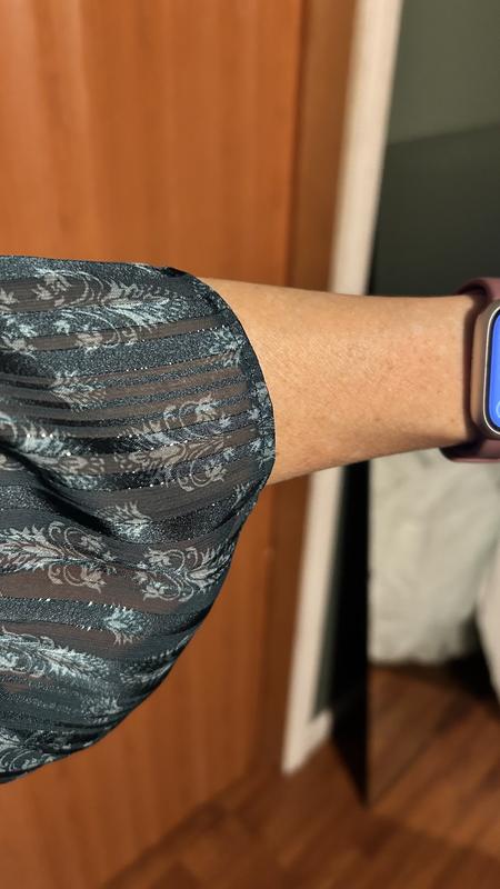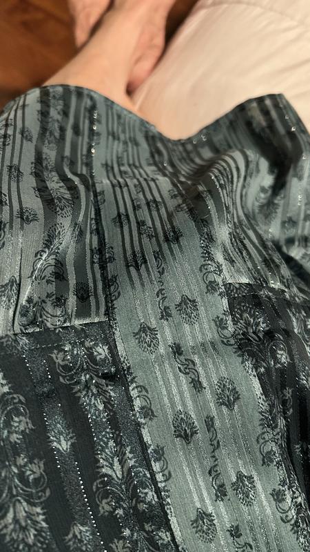 Love the unusual design. The shine is nice and makes this a bit dressy. The sleeves are nice.
