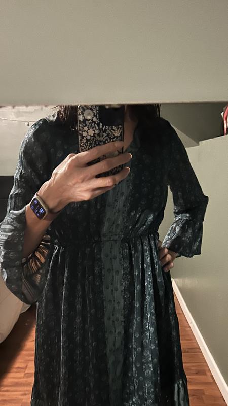 This Style & Co. dress is ok. It’s long sleeve, more suitable for a Fall weather. The quality ok and look cheap. You can dress it up with a denim jacket and a bootie. The color combination is not my favorite but if you like glittery, then this dress is for you.
