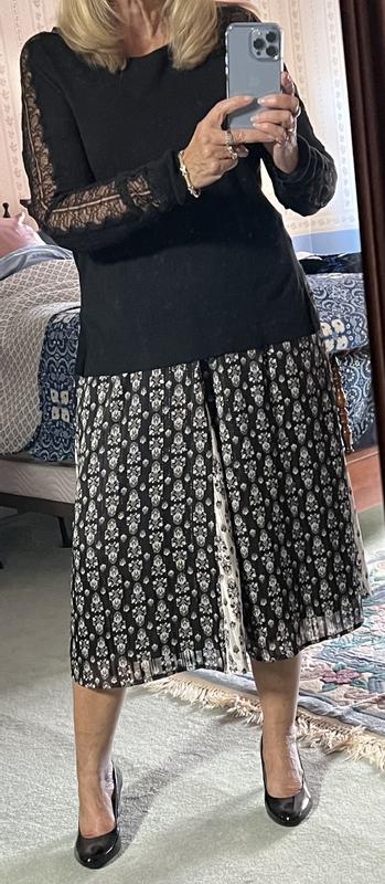 It is a very comfortable skirt with pockets which is always a plus. I paired it with a few different tops. I felt that the black sheer overlay type top worked best. Although the cream colored top did give it a different look. The sizing is right on as it is a petite and it wasn't too long for me. I felt it was more on the dressy side. The material was not scratchy at all.