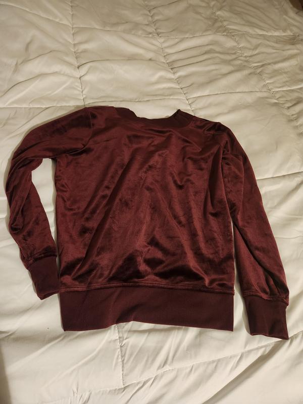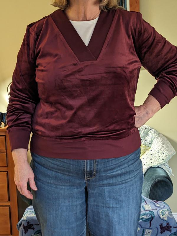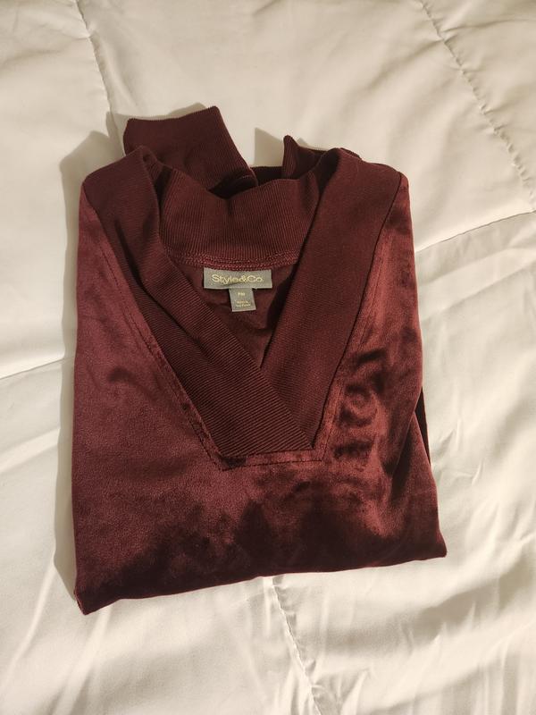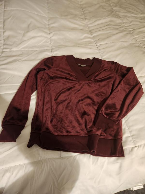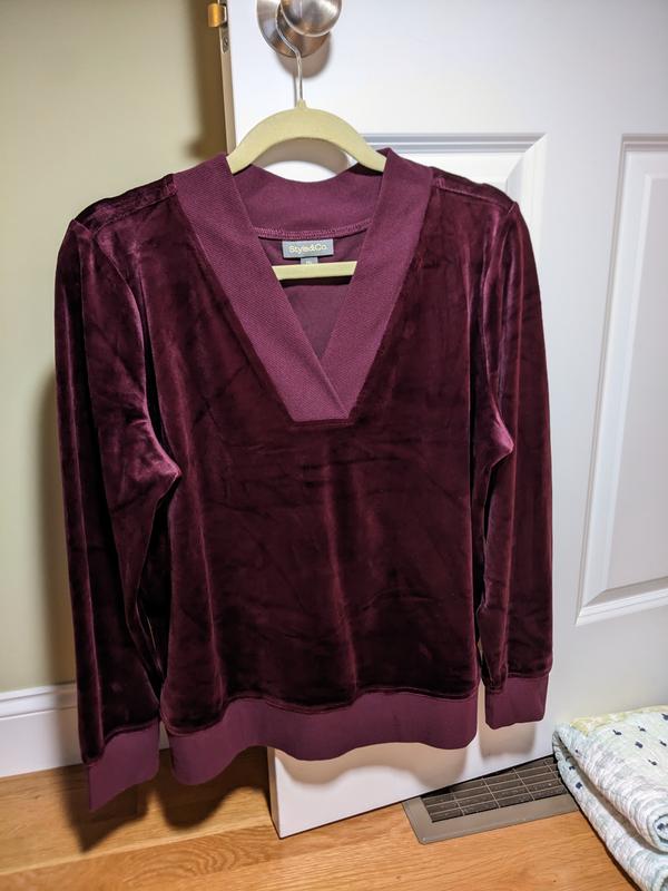 This velour v-neck is a rich burgundy color which is not a color that I wear frequently but it is great for the holidays especially if bright red isn't your best color (like me).The XL Petite is fairly well sized though I could still use shorter sleeves and length of the garment.The velour is soft and silky and drapes nicely. There were some packaging and folding wrinkles that did not completely disappear after washing and hanging to dry but it's still wearable.