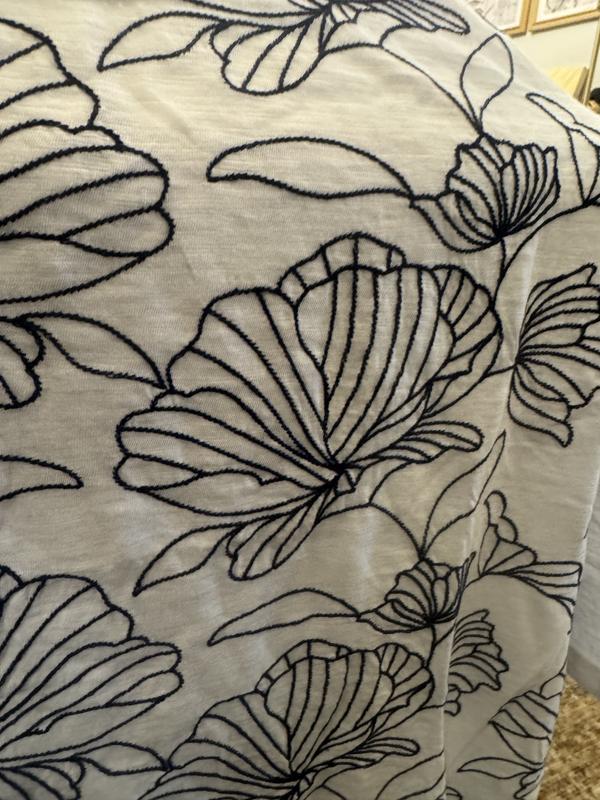This is a really cute top. The embroidery of the flowers makes it very interesting and different. I would wear it with some jeans or black pants. I like the three-quarter sleeves overall I highly recommend it lightweight and comfortable.