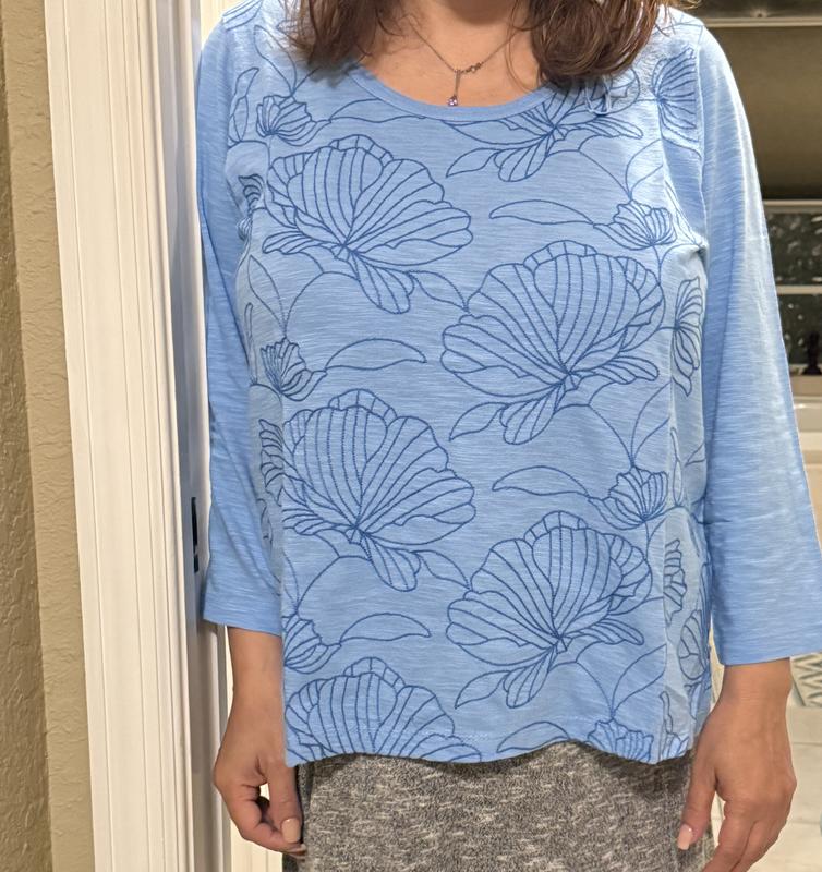 Received the Style & Co. Petite Embroidered-Front Top in Sky Dew to review. It is a beautiful soft blue with darker blue embroidery on the front. Loved the color and feel. Unfortunately, for me, it was too loose around the mid-section and just didn't look good on me (wish it had).