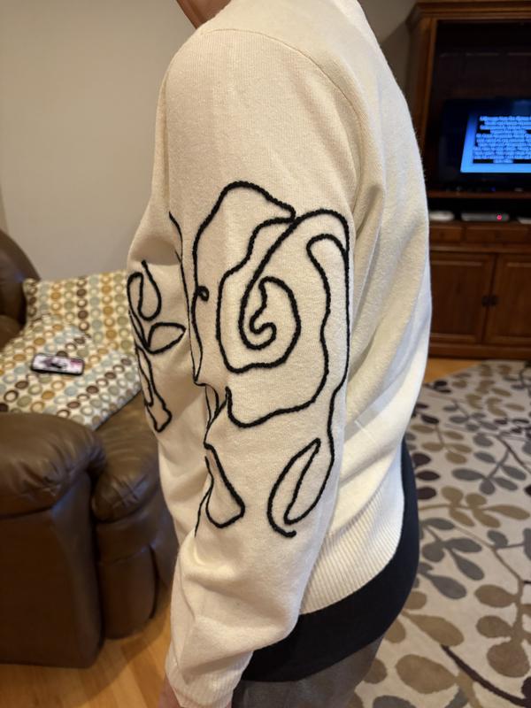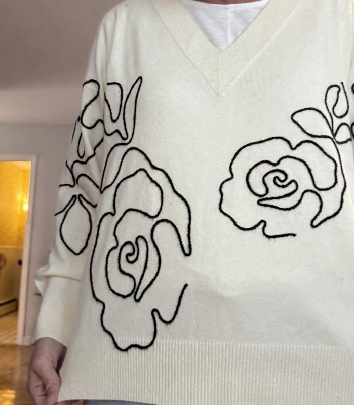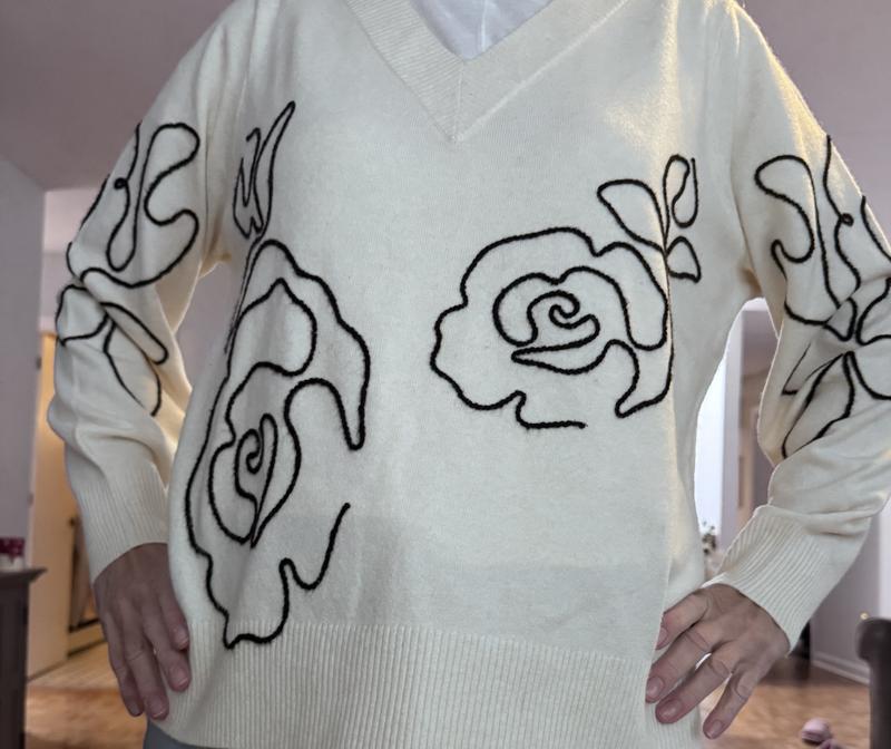 This sweater is soft and pretty. It’s a cream color with a black floral yarn design. The design takes the sweater from basic to stylish and dressy. It’s a medium weight cotton and acrylic material. It is slightly itchy, so that is my only complaint.